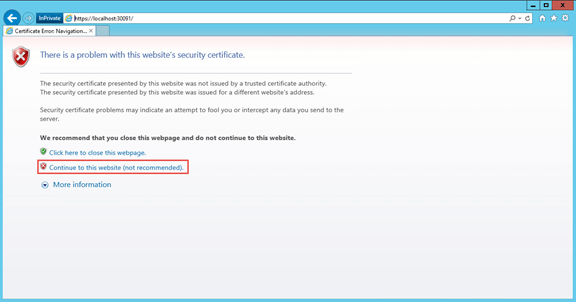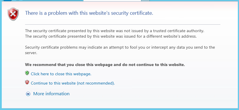 Often, we spin up virtual machines for development & testing purposes of Windows Azure Pack (as part of Team Access Control Resource Provider or other engagements). Typically we develop against an express deployment. One of the very time consuming process during development is to click on ‘continue to this website’ from the certificate validation error message while accessing admin portal & tenant portal. Since the portal automatically redirect to the authentication site, it also prompts for the same, which adds to the pain. 😦