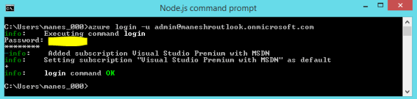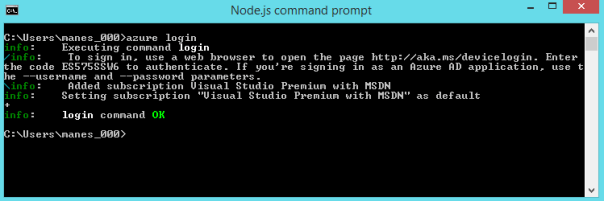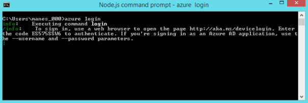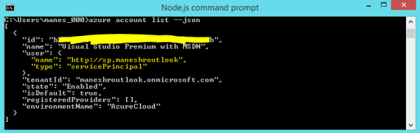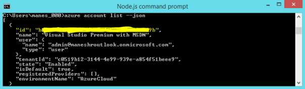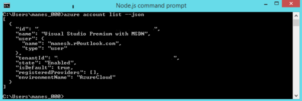 Now you are logged in and can execute ‘azure account list –json’ command or other commands to verify that login is successful.