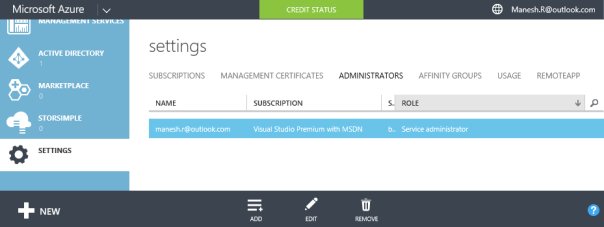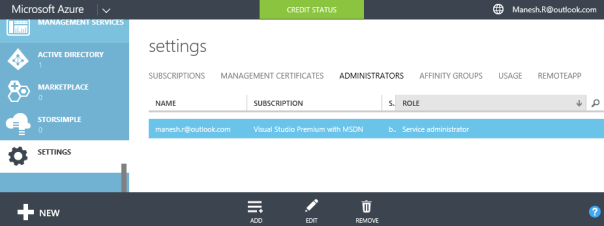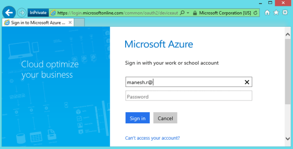 For this login option, I am using the Microsoft Account – manesh_dot_r_at_outlook_dot_com, who is the service administrator for the subscription.