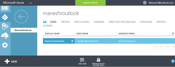 First let us create an organizational account in the same directory. You can do this by navigating to Active Directory > <your_directory> > Users. Note that in my environment, your_directory is maneshroutlook.