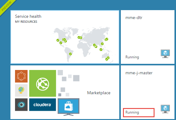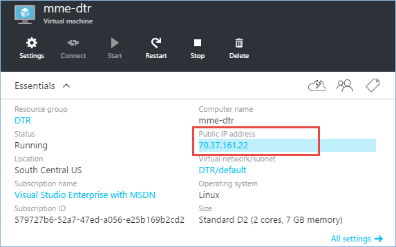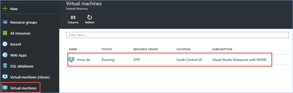 Click on Virtual Machines (remember, we created the virtual machine with Resource Manager as the deployment model) and click on mme-dtr