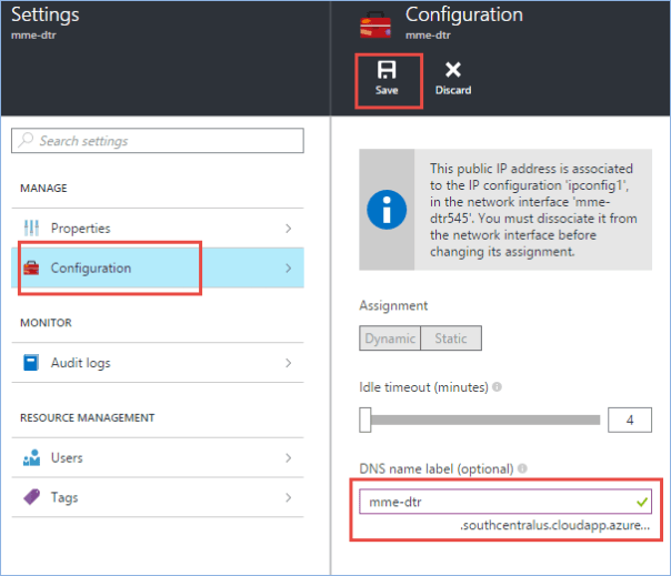 Click on Configuration, enter mme-dtr for DNS name label and click Save. Note that sometimes dns names might be already reserved by someone else, so choose different name if the default vm name is not available.