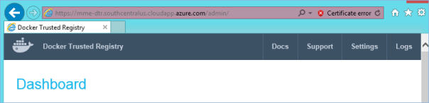 Ensure you can browse to the virtual machine with public DNS name. In this case it is https://mme-dtr.southcentralus.cloudapp.azure.com. Ignore the certificate error.