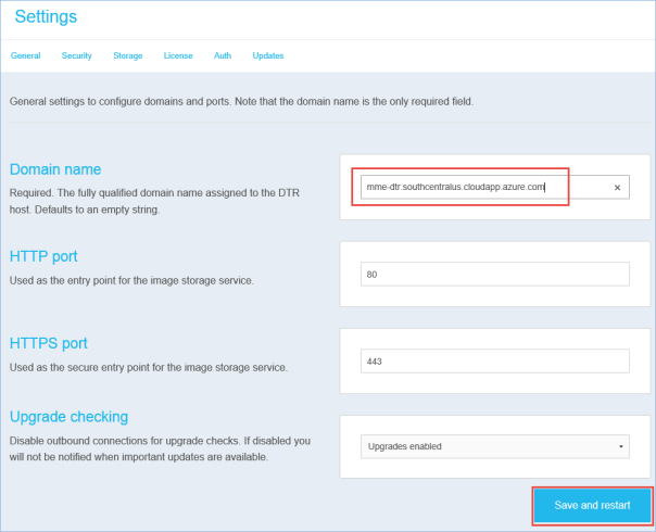 Since we do not have a valid SSL certificate on Docker Trusted Registry server for HTTPS, we need to ensure that docker service starts with ‘–insecure-registry mme-dtr.southcentralus.cloudapp.azure.com’ option. For this we need to edit /etc/default/docker file.
