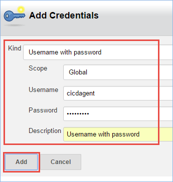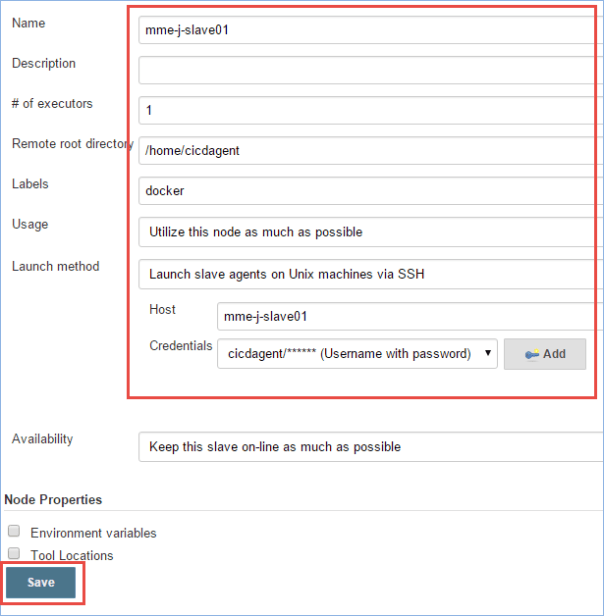 On node details page, provide slave node information. Click on Add button for credentials and create a username with password credential. It is important to keep label for node as docker. This label is used later to associate Jenkins Job to the slave node.