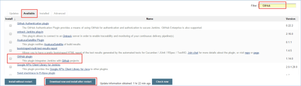 Click Available, type GitHub in the filter, choose GitHub Plugin from the results, and click Download now and install after restart