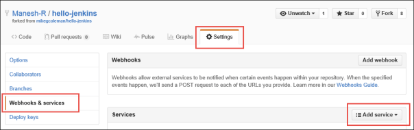 Open browser and navigate to your GitHub repository (https://github.com/Manesh-R/hello-jenkins). Note that you need admin permissions on the repository.