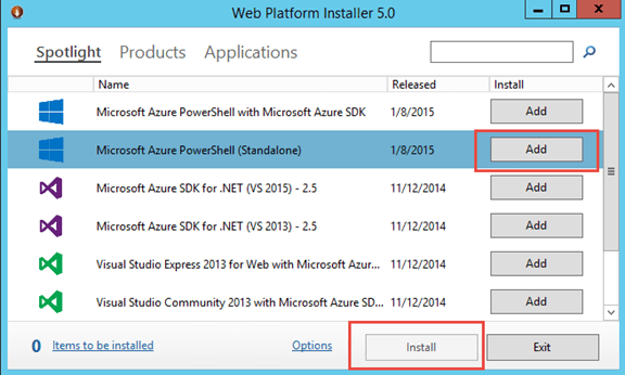- Download and install ‘Microsoft Azure PowerShell’ from Web Platform Installer. If you do not find that in ‘Spotlight’ you can perform a search for ‘Microsoft Azure PowerShell’