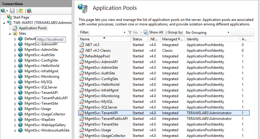 - Changed the Identity of ‘Tenant API’ application pool to Administrator