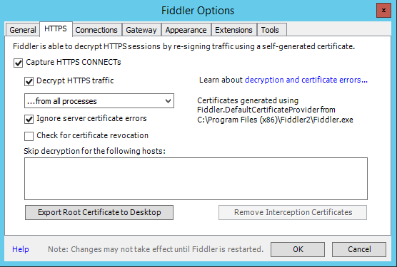 - Configure Fiddler to capture HTTPS traffic (Fiddler : Tools > Fiddler Options)